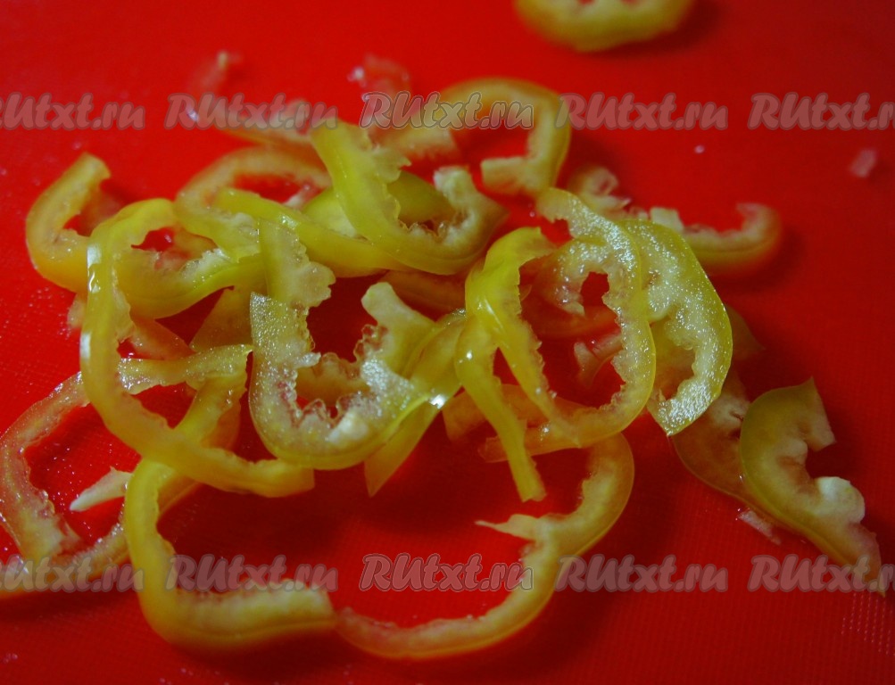 Болгарский перец нарезать тонкими полукольцами. Добавить в суп. Варить 2 минуты.