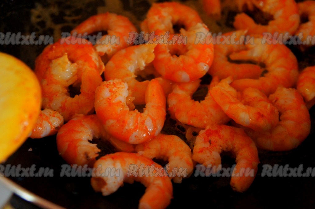 Креветки очистить, поджарить на сковороде в течение 2 минут на сливочном масле, добавив соль и паприку. Периодически помешивать.