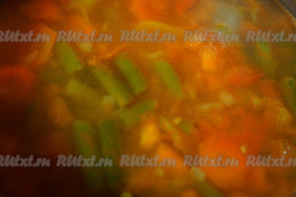 Добавить в бульон стручковую фасоль, перемешать, варить 3 минуты.
