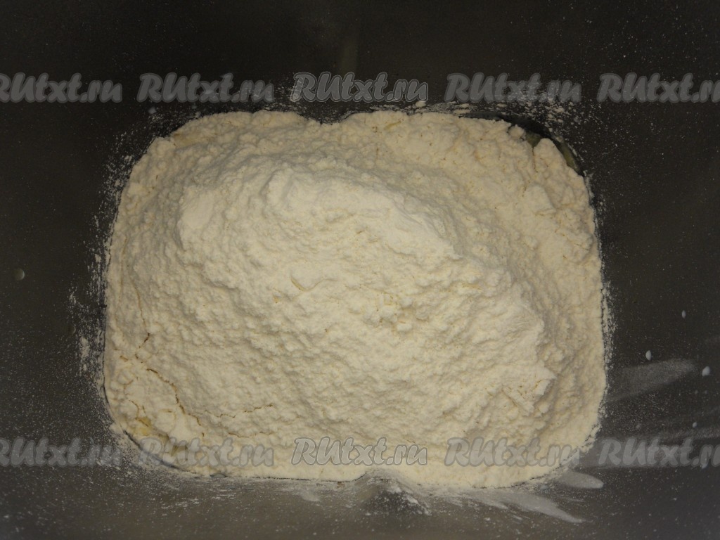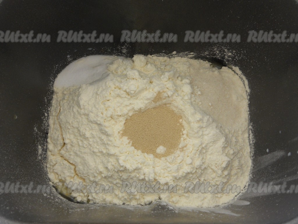 По углам всыпать соль и сахар, а по середине сделать небольшую ямку и всыпать в нее дрожжи.