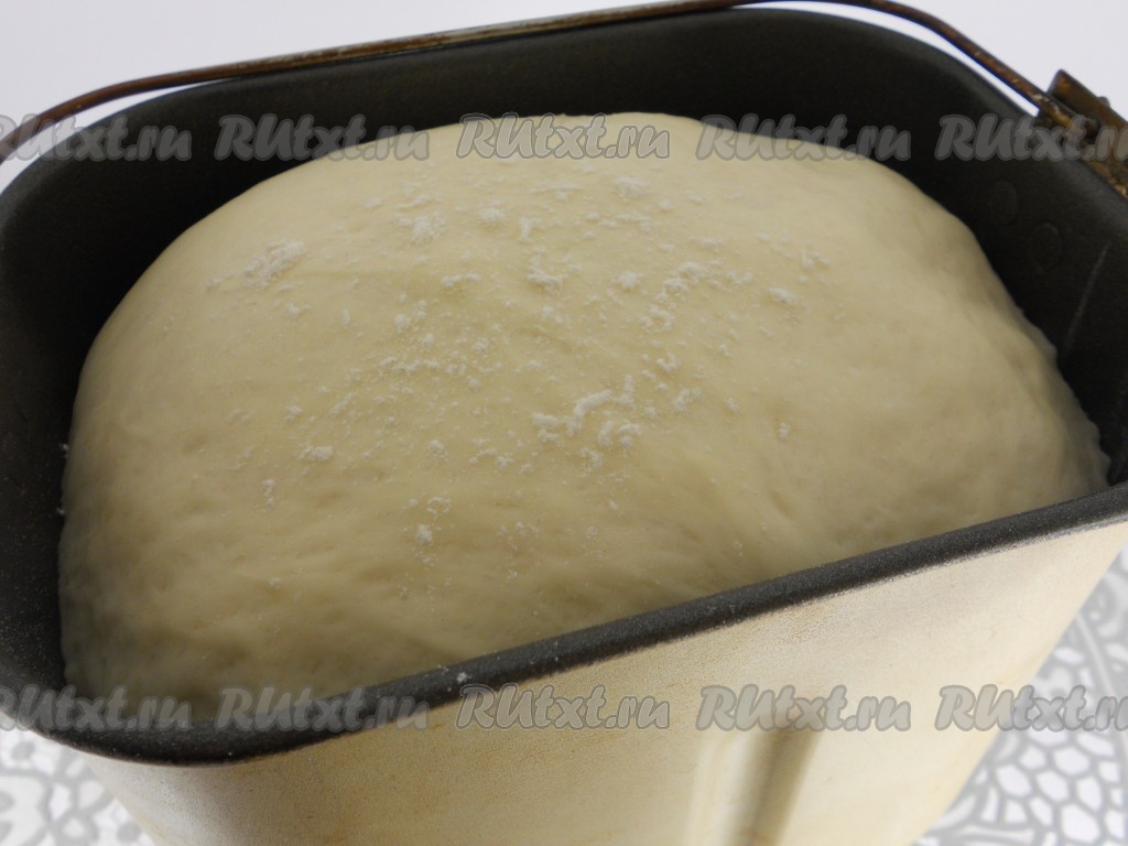 Поместить ведерко в хлебопечку и выставить программу "Тесто" (у меня - 1 час 30 минут). Тесто готово! Если у вас нет хлебопечки, тесто можно замесить и руками. Для этого просейте муку, сделайте углубление. Добавьте в него сахар и дрожжи. Молоко смешайте с растопленным маргарином, солью и растительным маслом. Понемногу вливайте в углубление молочную смесь, замешивая тесто. Тесто вымесить, оно должно быть мягким, но не липким. Оставьте тесто, накрыв чистым полотенцем, в теплом месте на 1 час для подхода.