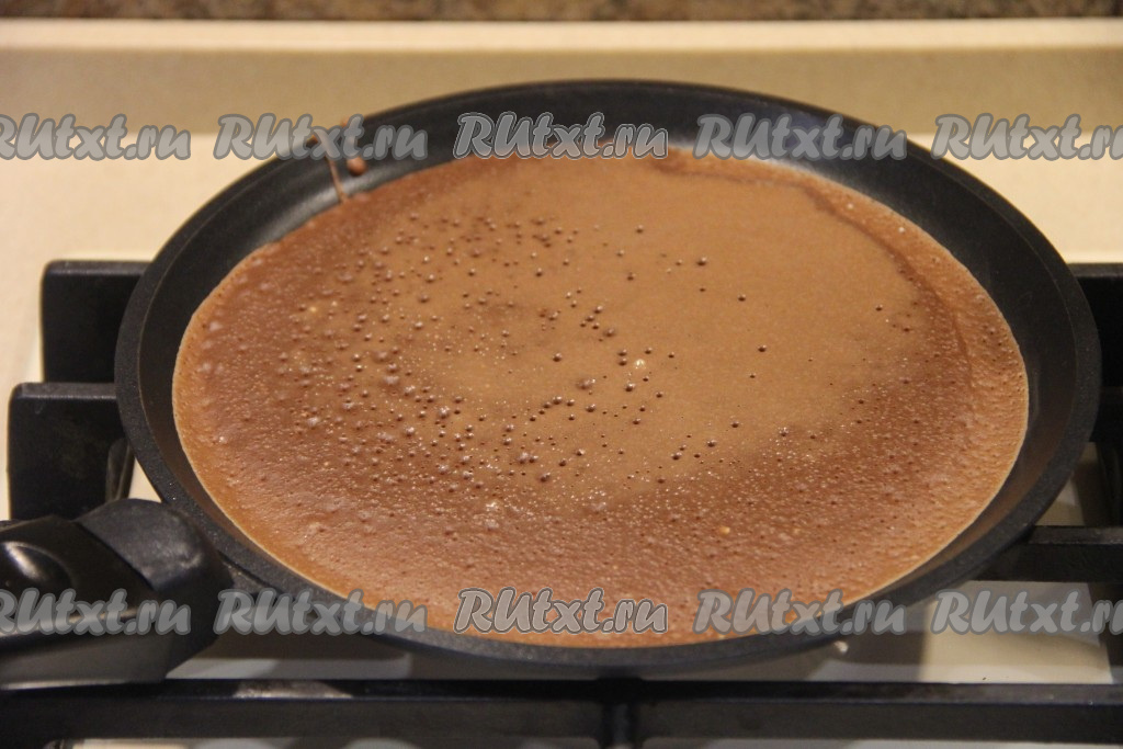 Сковороду смазать маслом только перед первым блином, последующие блинчики хорошо переворачиваются, поэтому маслом сковородку можно не смазывать (впрочем, многое зависит от качества сковороды). Поставить сковороду на огонь, дать ей хорошо разогреться. На раскалившуюся сковороду вылить пару столовых ложек теста и хорошо распределить по дну сковороды. Выпекать шоколадный блинчик на среднем огне с двух сторон, затем переложить на тарелку. Периодически перемешивая блинное тесто, постепенно пожарить все блины, складывая их один на другой на тарелку.