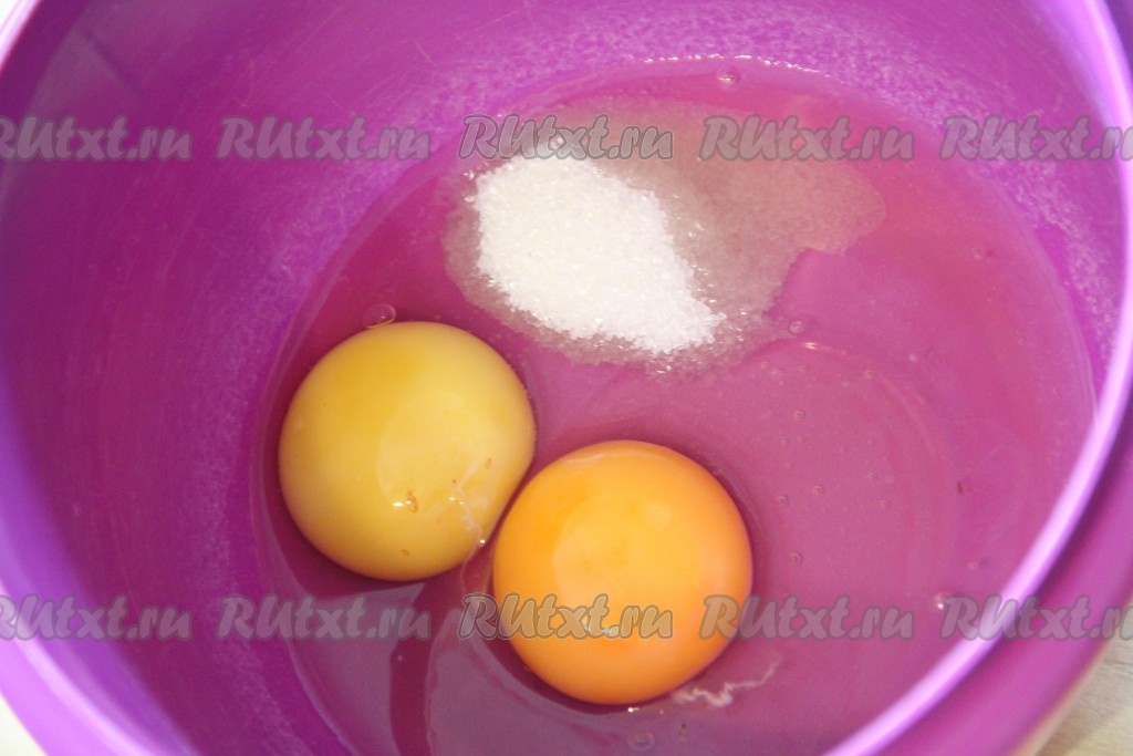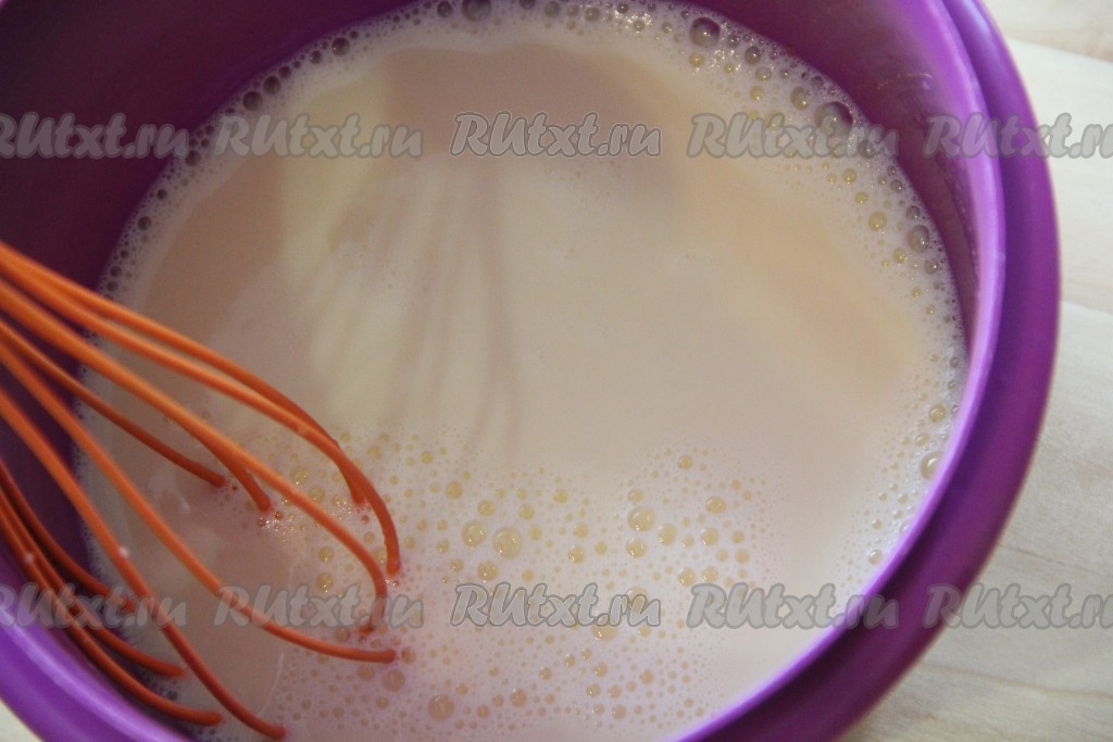 Хорошо взбить яйца с сахаром с помощью венчика. Затем добавить молоко и соль, ещё раз хорошо взбить.