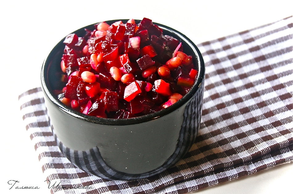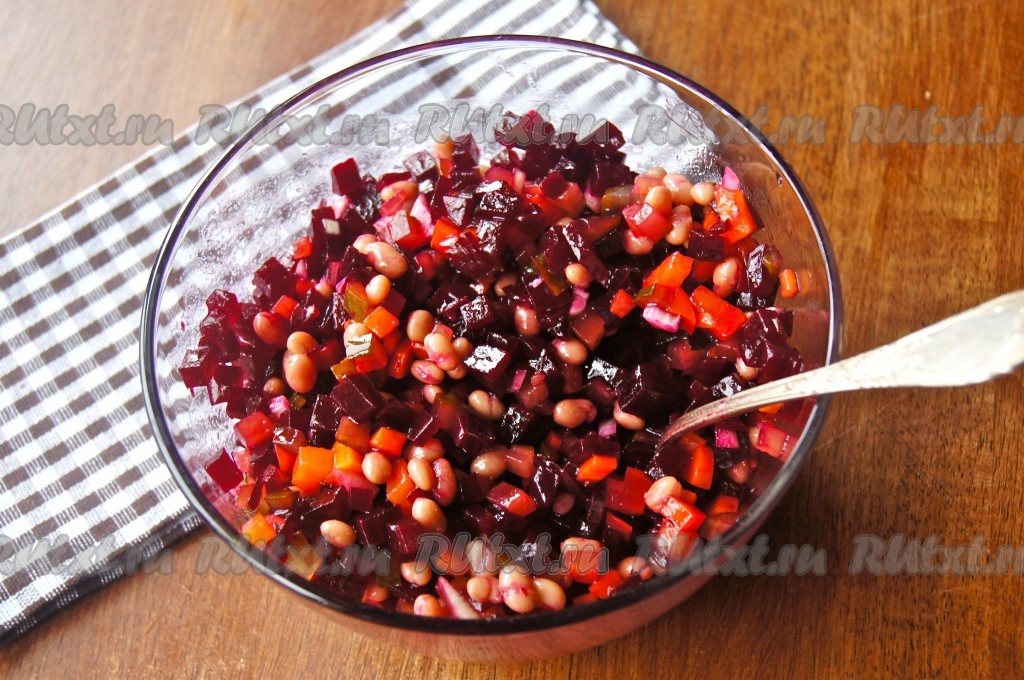 Вкусный, яркий винегрет с консервированной фасолью готов.