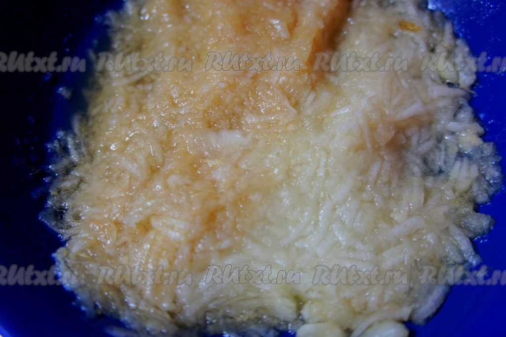 Груши очистить от кожуры, удалить семечки. Натереть груши на крупной тёрке. Лишний сок отжать и перелить на сковороду.