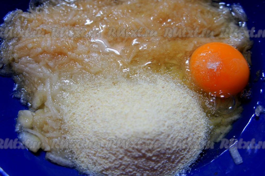 К грушам добавить яйцо, щепотку сахара и манку. Всё тщательно перемешать.