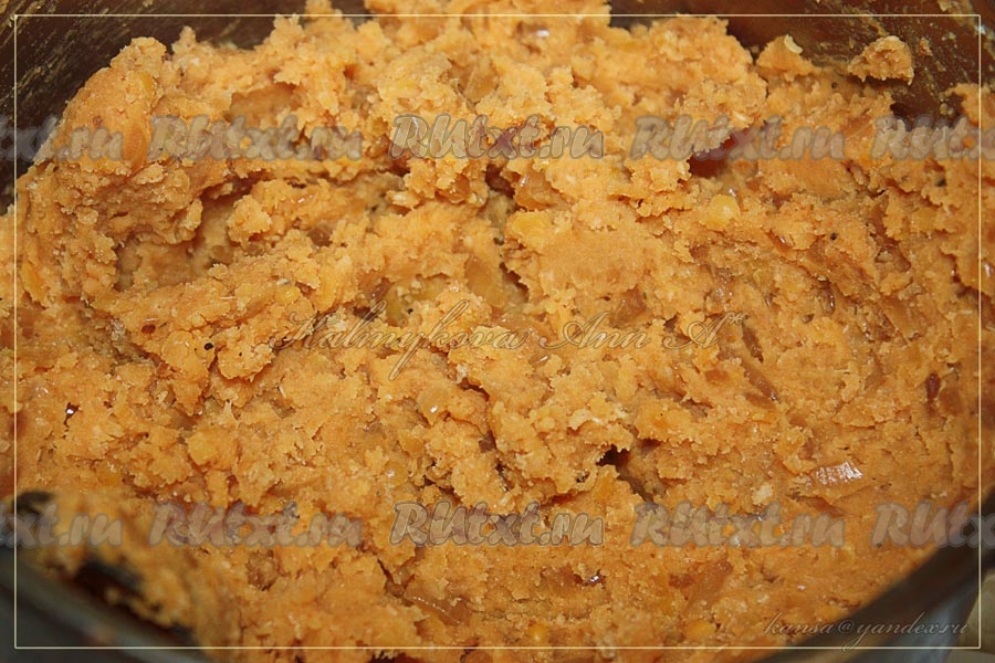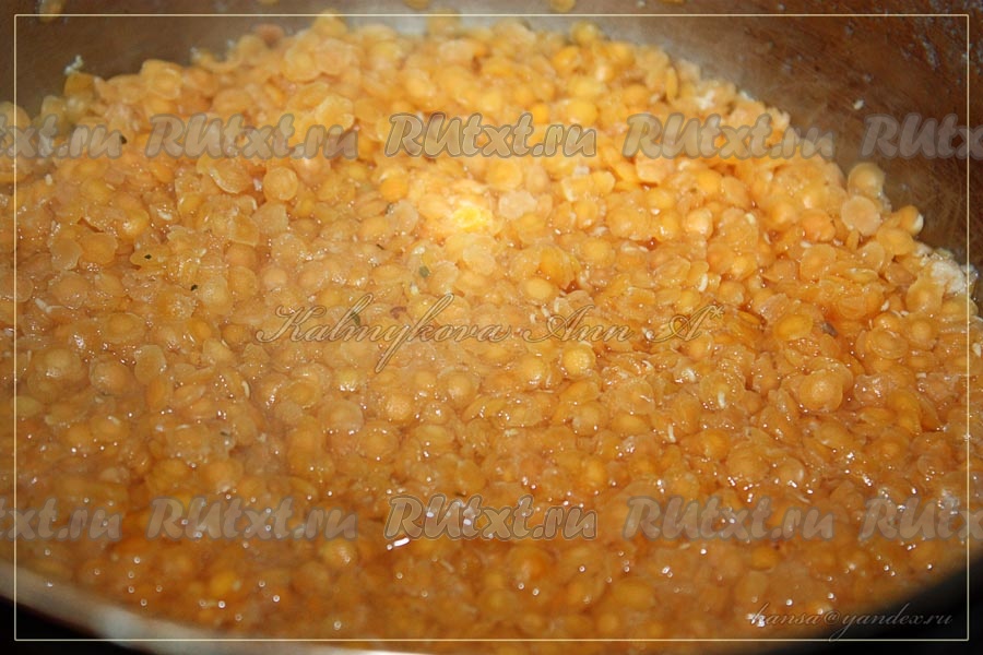 Промыть красную чечевицу и отварить до готовности (варить около 10-12 минут, остатки воды, если таковые будут, не сливать, а постараться отварить так, чтобы воды в готовой чечевице уже не оставалось).