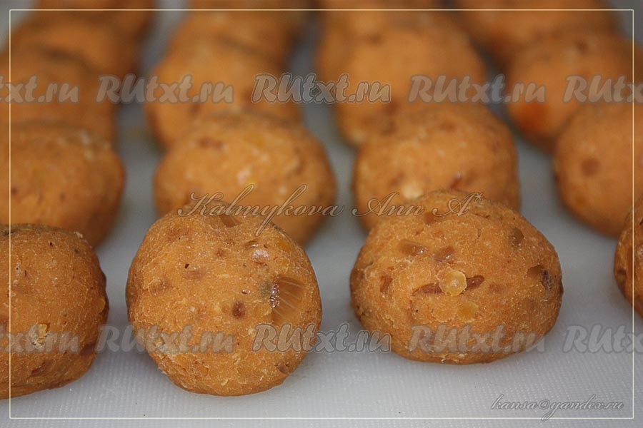Лепите, как душа пожелает, я сделала закуску в виде шариков размерами с грецкий орех.