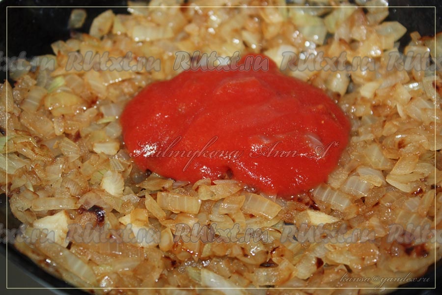 Добавить протертые помидоры и продолжить жарить лук еще минут пять.