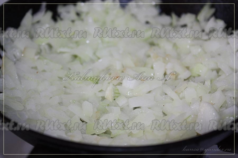 Очищенный лук мелко порубить и обжарить на сковороде в небольшом количестве растительного масла до золотистого цвета, периодически помешивая.