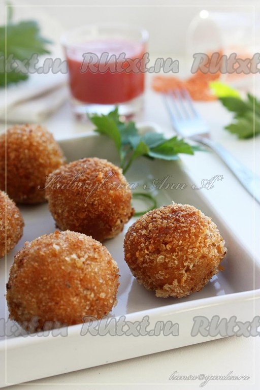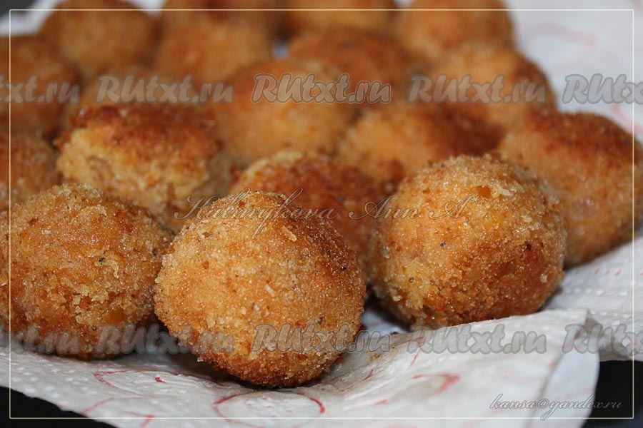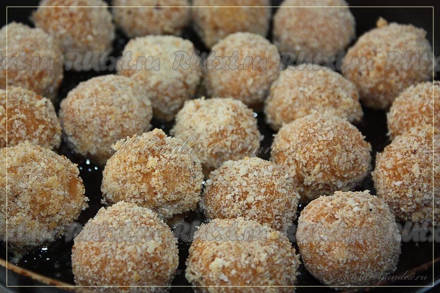 Обжарить шарики на растительном масле со всех сторон до золотистой корочки.