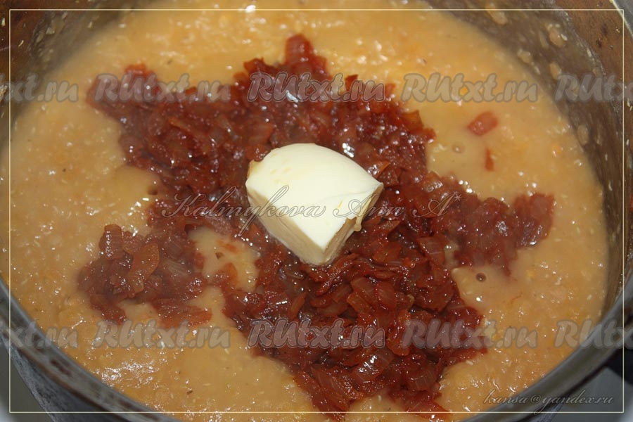 Добавить сливочное масло и обжаренный лук, хорошо перемешать и подержать еще минутку на медленном огне.