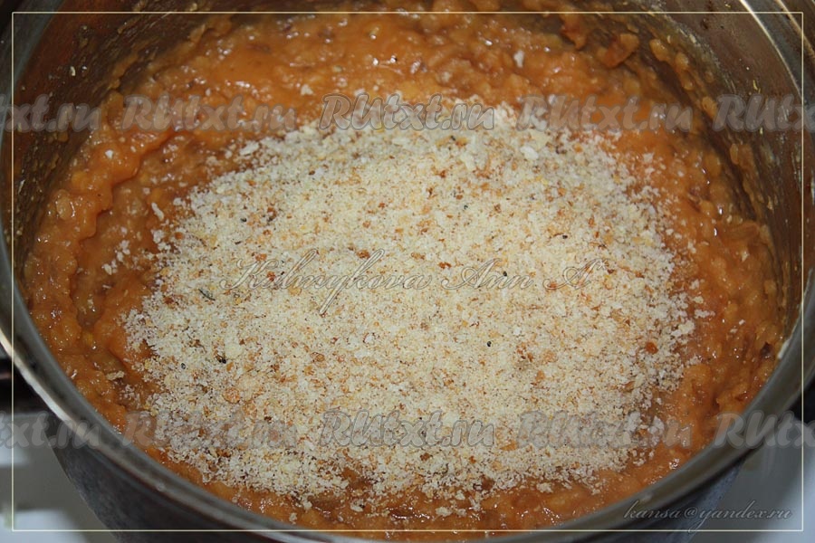 Одну часть панировочных сухарей положить в готовое чечевичное пюре.
