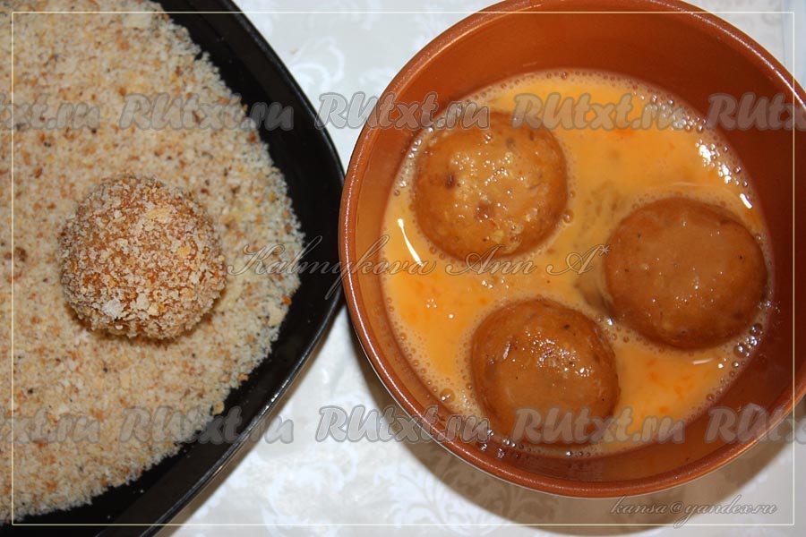 Обвалять шарики из чечевицы во взбитом яйце и панировочных сухарях.