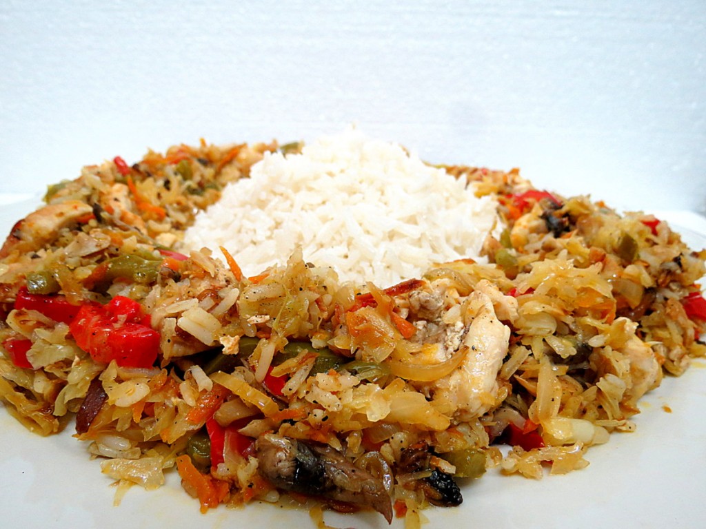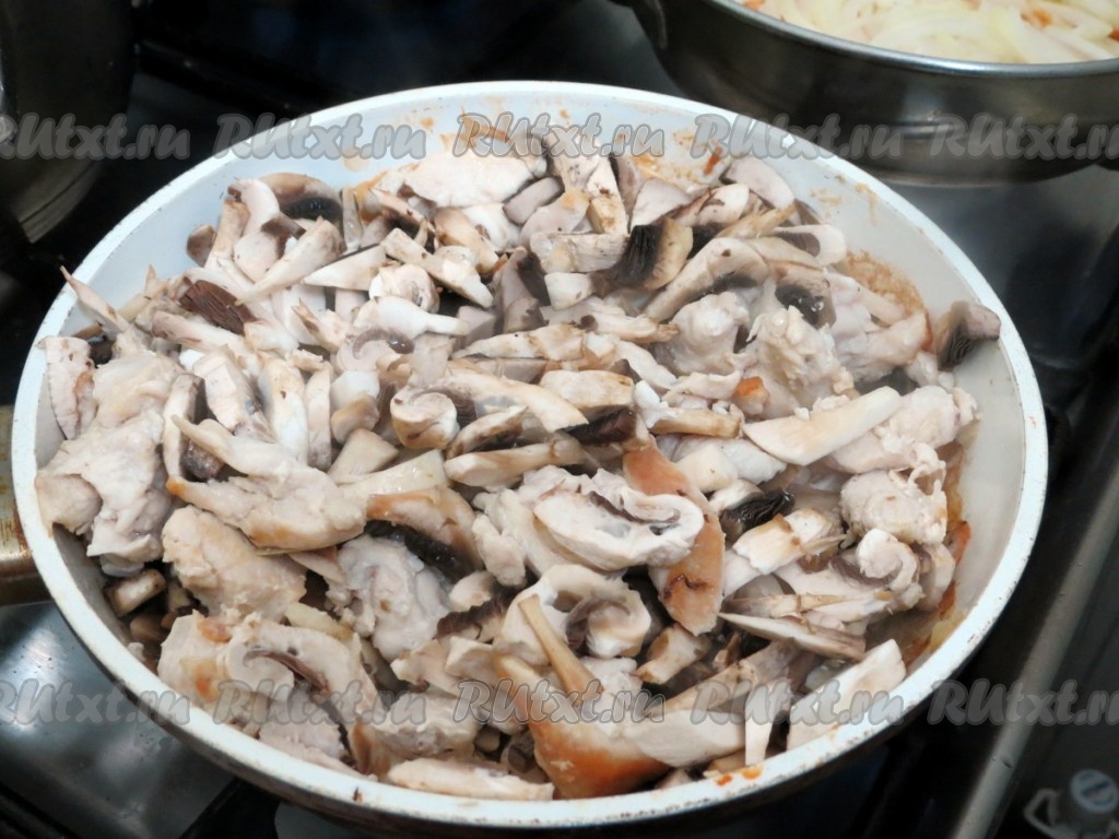 Шампиньоны нарезаем произвольным образом и обжариваем на отдельной сковороде на растительном масле, помешивая, на небольшом огне 8-10 минут. Капусту, морковь, болгарский перец, лук, куриное филе и грибы перемешиваем, перчим и солим.