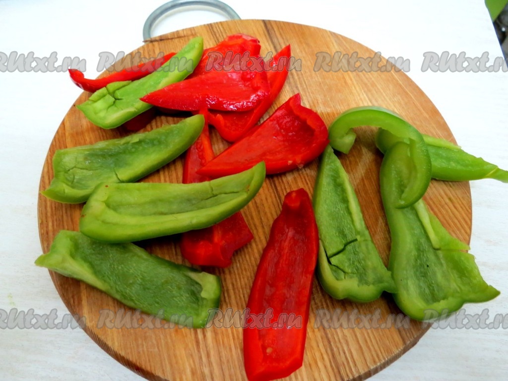 Чистим болгарские перцы от семян, плодоножки удаляем. Разрезаем каждый перец на 6-8 частей, а затем поперёк на полоски.