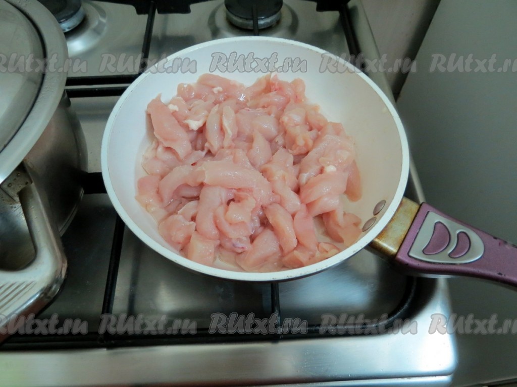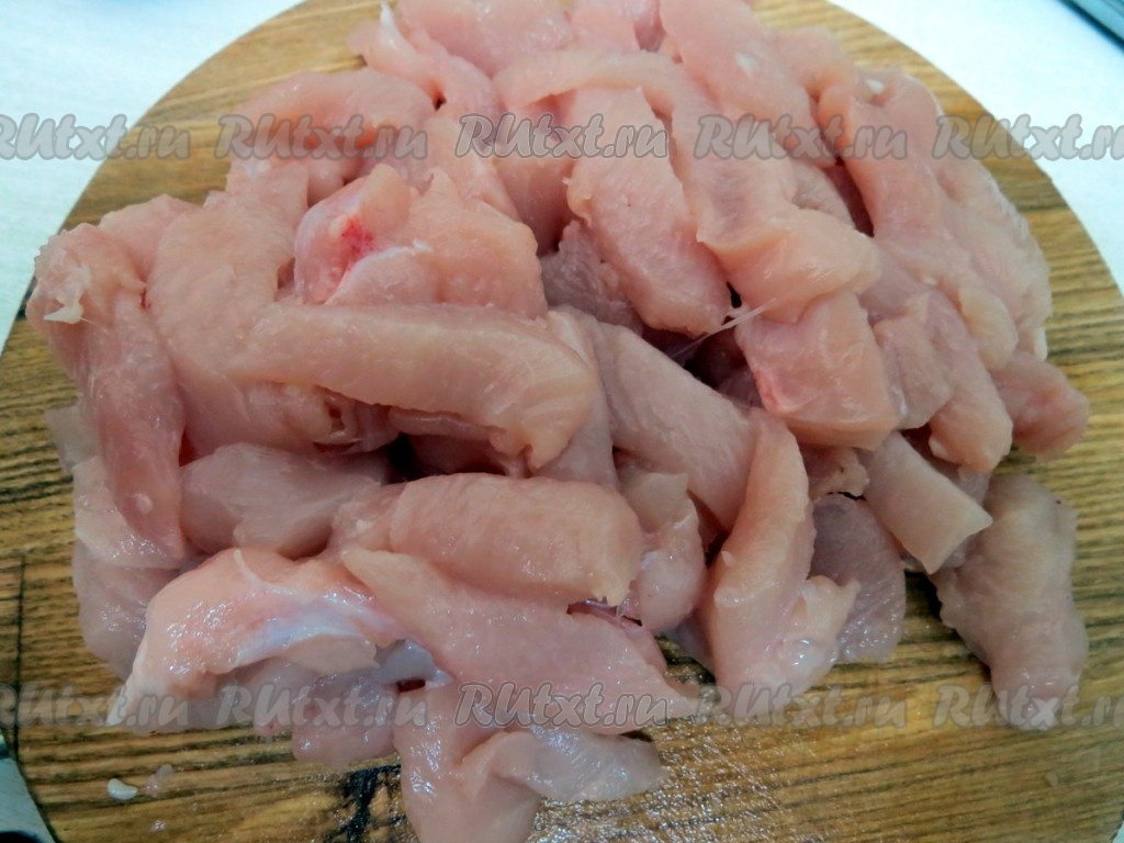 Куриное филе разрезаем на продольные кусочки.