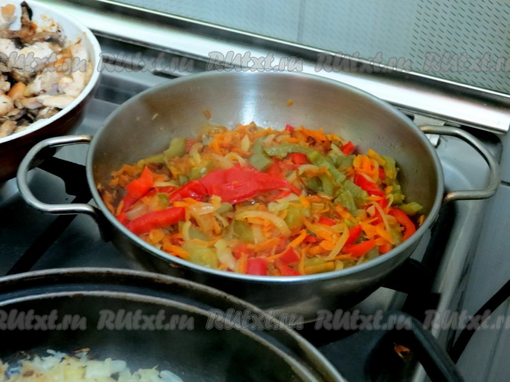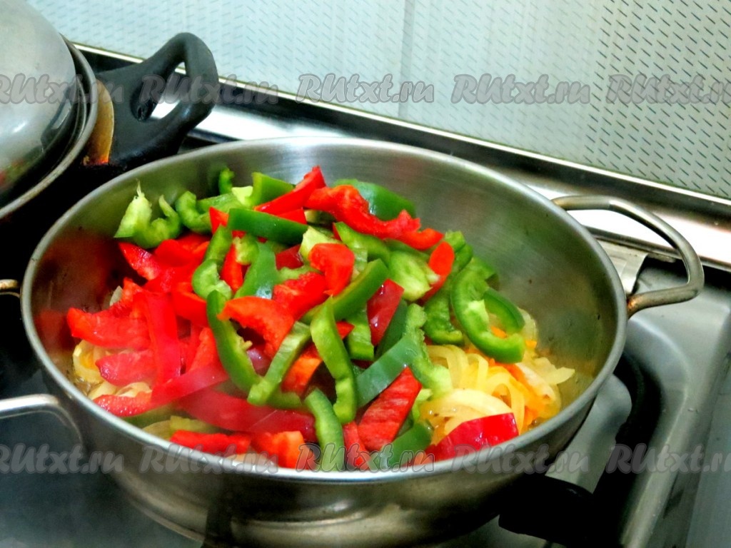 К луку и моркови добавляем нарезанный болгарский перец и обжариваем, не забывая помешивать, ещё минут 7-8.