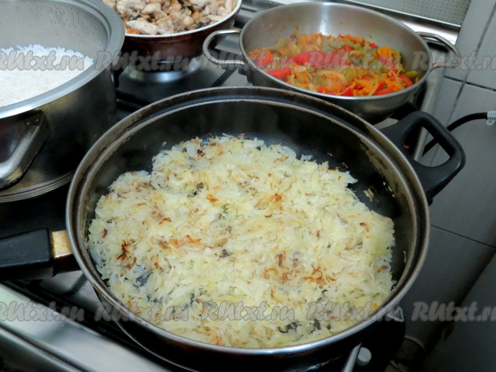 Капусту помещаем на отдельную сковороду и обжариваем на разогретом растительном масле, иногда помешивая, до золотистого цвета. Это займёт минут 5-7. Капуста готова.