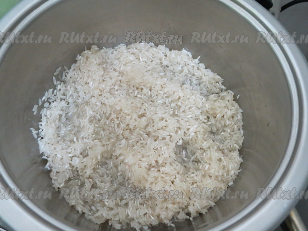 Начнём с приготовления риса. В кастрюлю наливаем 100 мл растительного масла, сильно нагреваем его, но не даём ему закипеть, всыпаем рис и продолжаем нагревать 2-3 минуты на самом маленьком огне. Рис должен стать прозрачным. Выдавливаем сок 0,5 лимона или добавляем щепотку лимонной кислоты. Доливаем 600 миллилитров кипятка. Газ убавляем до минимума и варим 20 минут под закрытой крышкой. Готовый рис заправляем по вкусу солью и перцем.