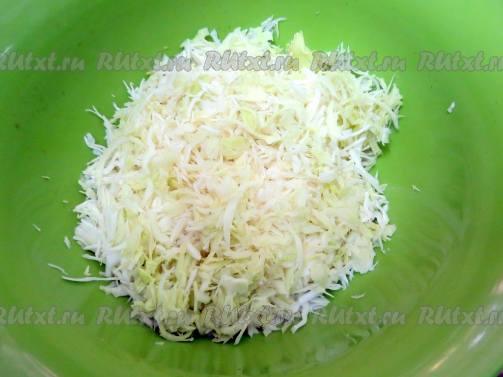 Капусту нарезаем достаточно мелко, помещаем в кипящую подсоленную воду и отвариваем в течение 7 минут, затем откидываем на дуршлаг, давая стечь лишней воде.