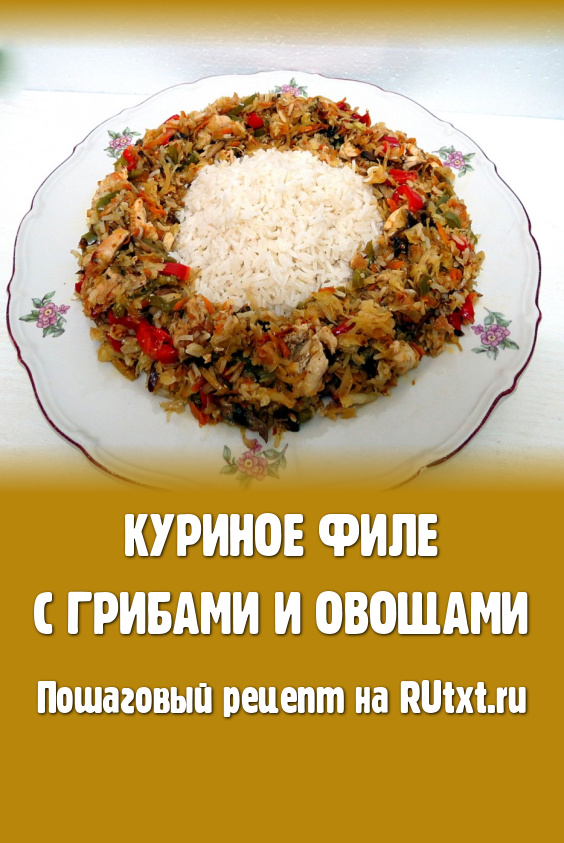 Куриное филе с грибами и овощами можно подавать с рисом по-разному. Можно мясо, овощи и грибы разложить вокруг риса, выложенного горкой в центре блюда, а можно всё перемешать с рисом. Блюдо получается очень вкусным.