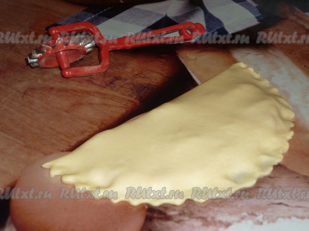 Сторону с мясом накрыть чистой половиной теста, аккуратно прижать края получившегося чебурека (края теста должны быть хорошо скреплены, чтобы при жарке не вытек сок из начинки).
