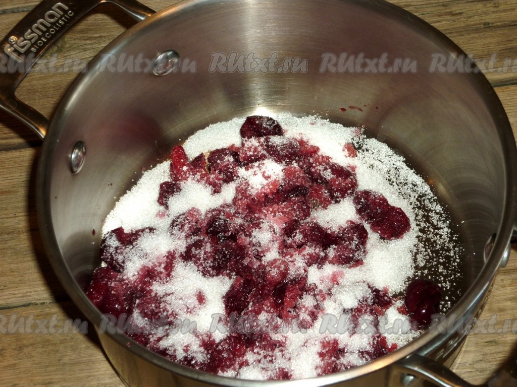 Для приготовления соуса в кастрюлю положить вишню без косточек и сахар, влить воду.