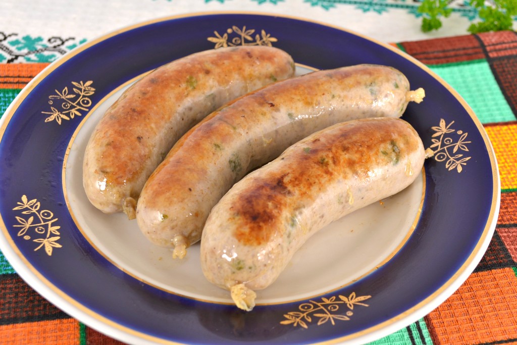 Мне хотелось сделать колбаски по типу мюнхенских белых колбасок, поэтому готовые горячие колбаски я сразу же поместила в холодную воду на 2-3 минуты. Таким образом колбаски останутся белыми и не потемнеют. Кушать нужно сразу, в горячем виде, снимая свиную оболочку. Подать эти сочные домашние колбаски можно с острым соусом.