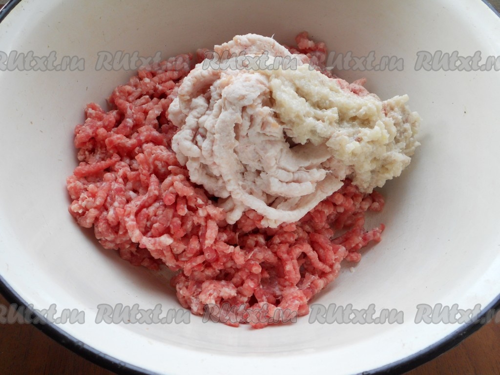 Лук очистить. Свинину и сало вымыть, обсушить. Пропустить через мясорубку свинину, сало и лук, перемешать.