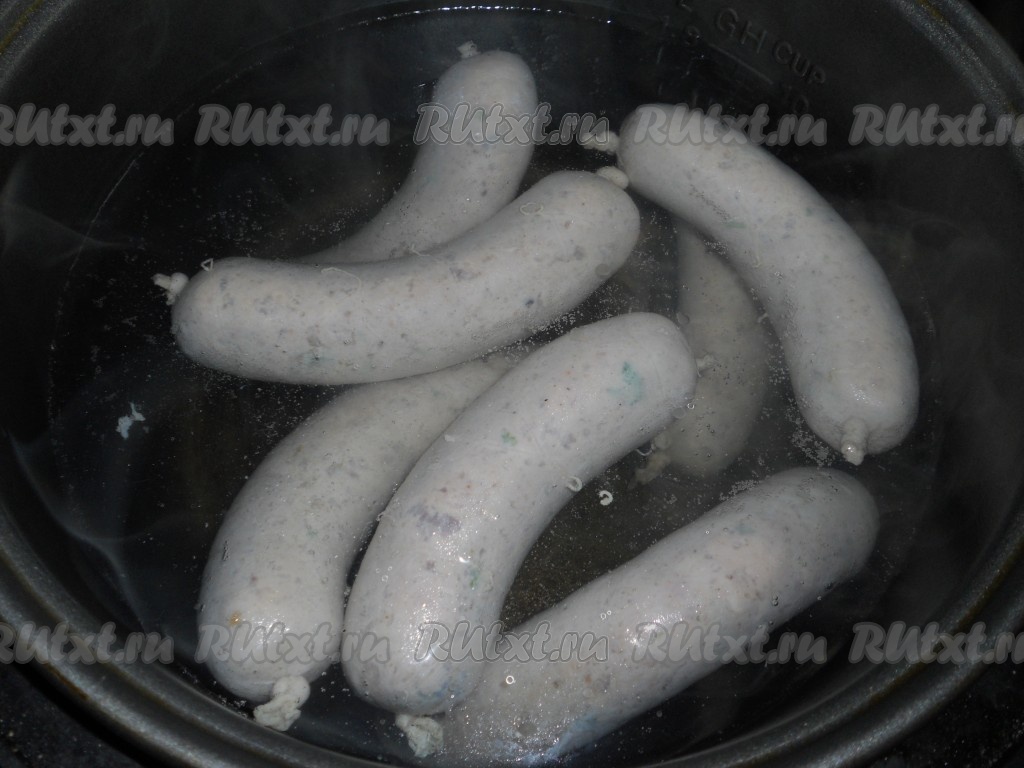 Очень удобно делать это в мультиварке. Я выставляю режим "Мультиповар" на 97-98 градусов, время 1 час. Через 30 минут опускаю в воду колбаски, накрываю крышкой и варю оставшееся время (30 минут).