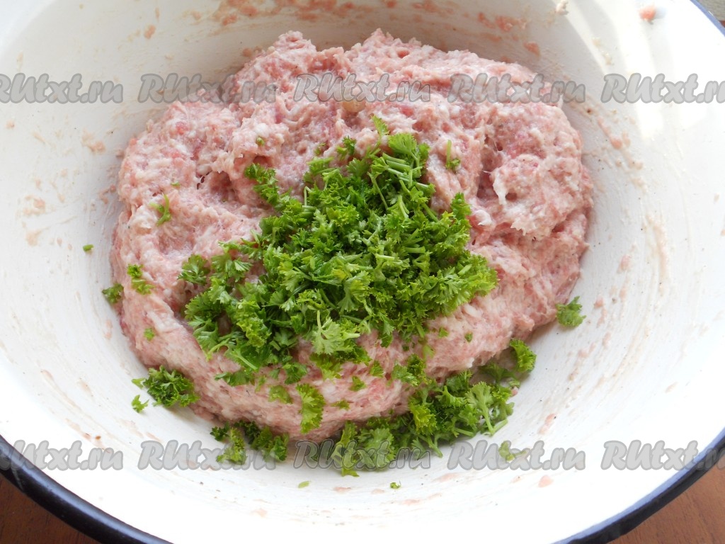 Далее фарш следует очень хорошо вымесить так, чтобы получилась почти однородная липкая масса. Добавить к фаршу свежую измельчённую петрушку (можно и не добавлять или добавить сушёную петрушку). Перемешать.