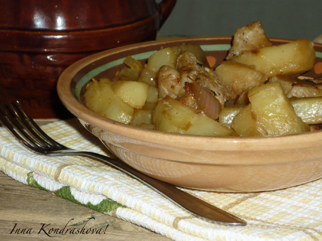 Затем достать горшочки из духовки. Свинина, приготовленная с картошкой, луком и морковью, получается ароматной и вкусной. Кусочки картофеля становятся мягкими и аппетитными. Подавать это сытное блюдо можно в горшочках, а можно разложить по глубоким тарелкам.