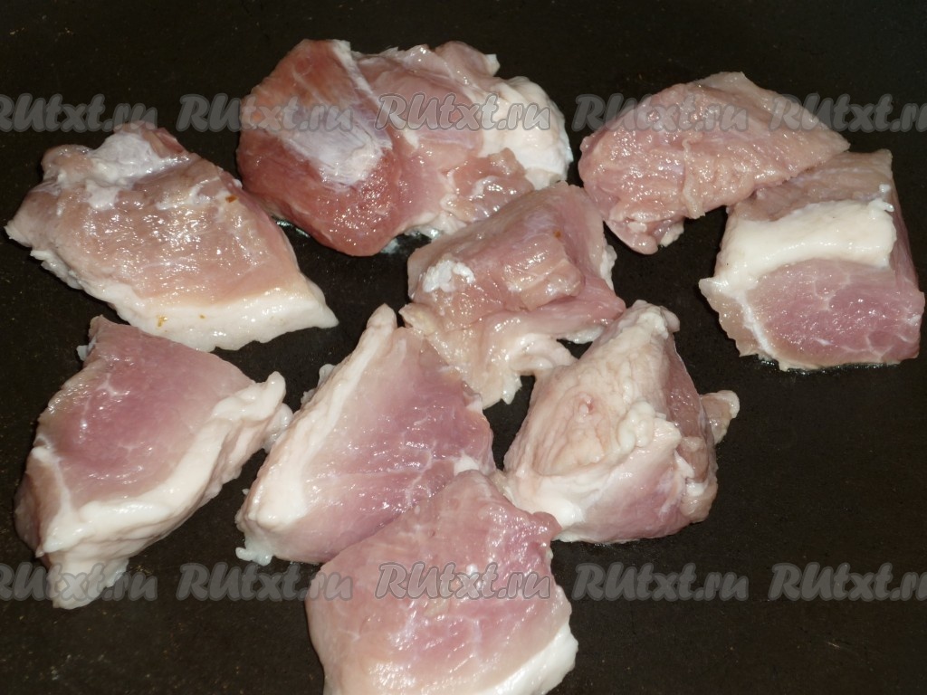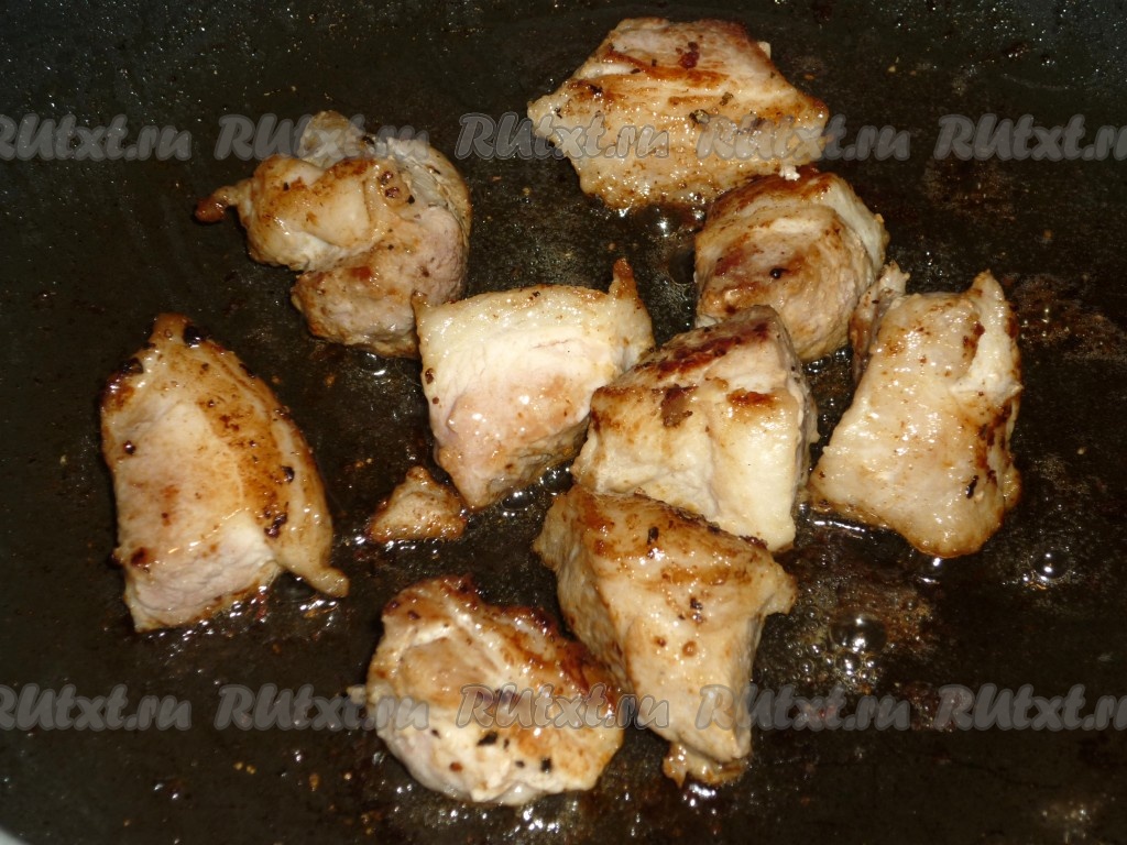 В сковороду влить немного растительного масла, разогреть, выложить кусочки свинины и обжарить их на достаточно сильном огне до румяной корочки с двух сторон. Мясо должно только подрумяниться, доводить до готовности мы его будем в духовке. Переложить обжаренную свинину со сковороды на тарелку.