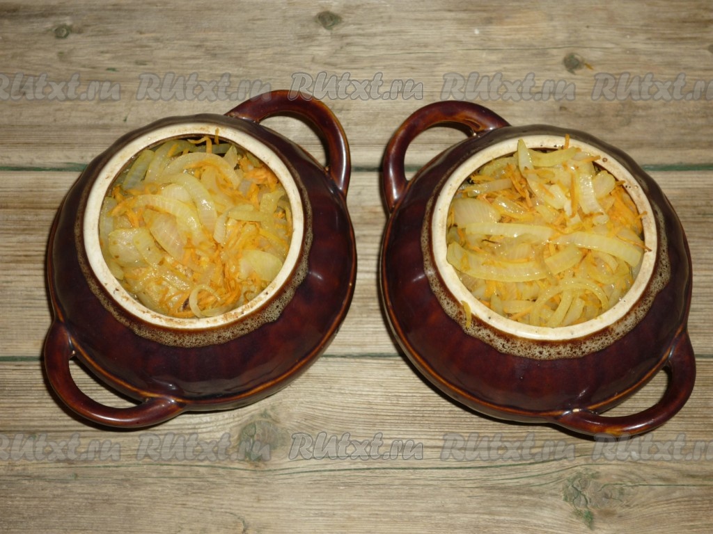На дно каждого горшочка налить 5-6 столовых ложек воды, выложить кусочки свинины, сверху разложить картофель и обжаренные морковку с луком. Накрыть горшочки крышками, поставить в холодную духовку. Включить духовку и готовить 1 час 30 минут при температуре 180 градусов. Готовность блюда можно проверить по картофелю, он должен легко прокалываться вилкой.
