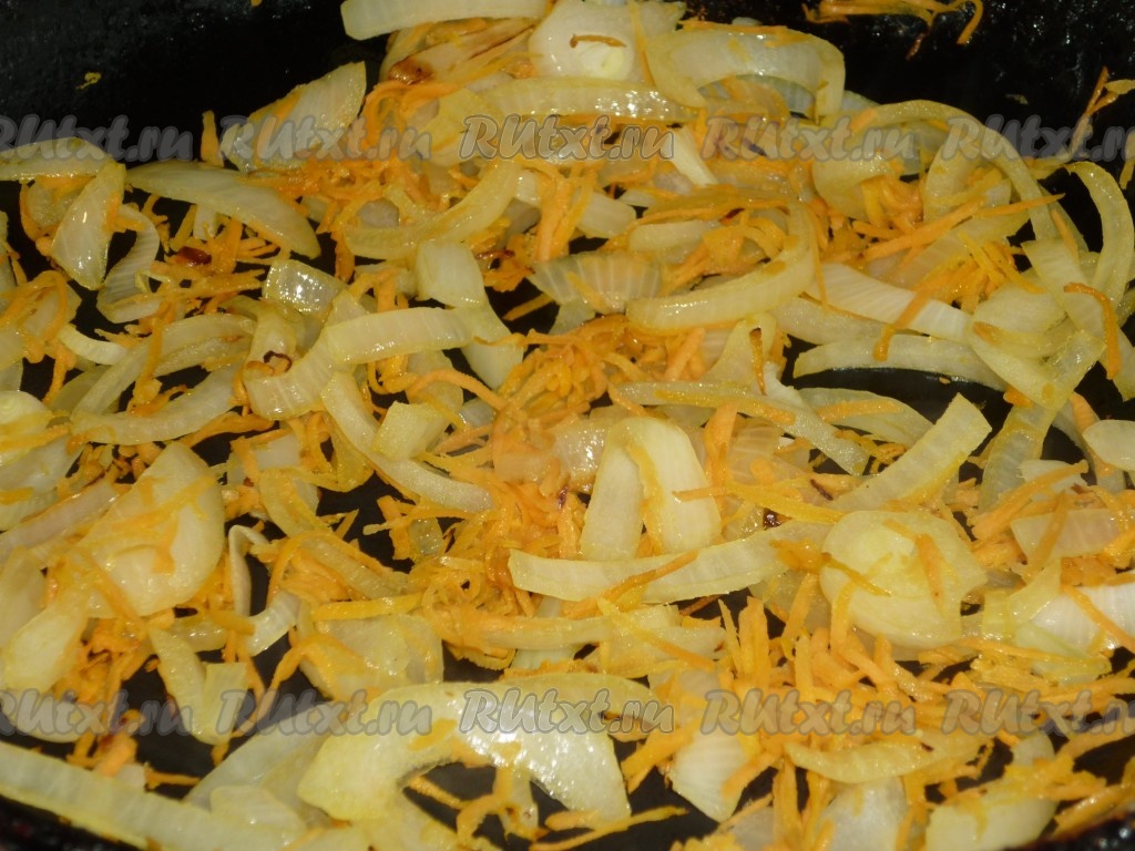 Лук и морковь почистить. Лук нарезать полукольцами, морковку натереть на крупной тёрке. Выложить овощи в сковороду, в которой обжаривалась свинина, перемешать овощи и обжаривать их, иногда помешивая, в течение 5 минут на среднем огне.