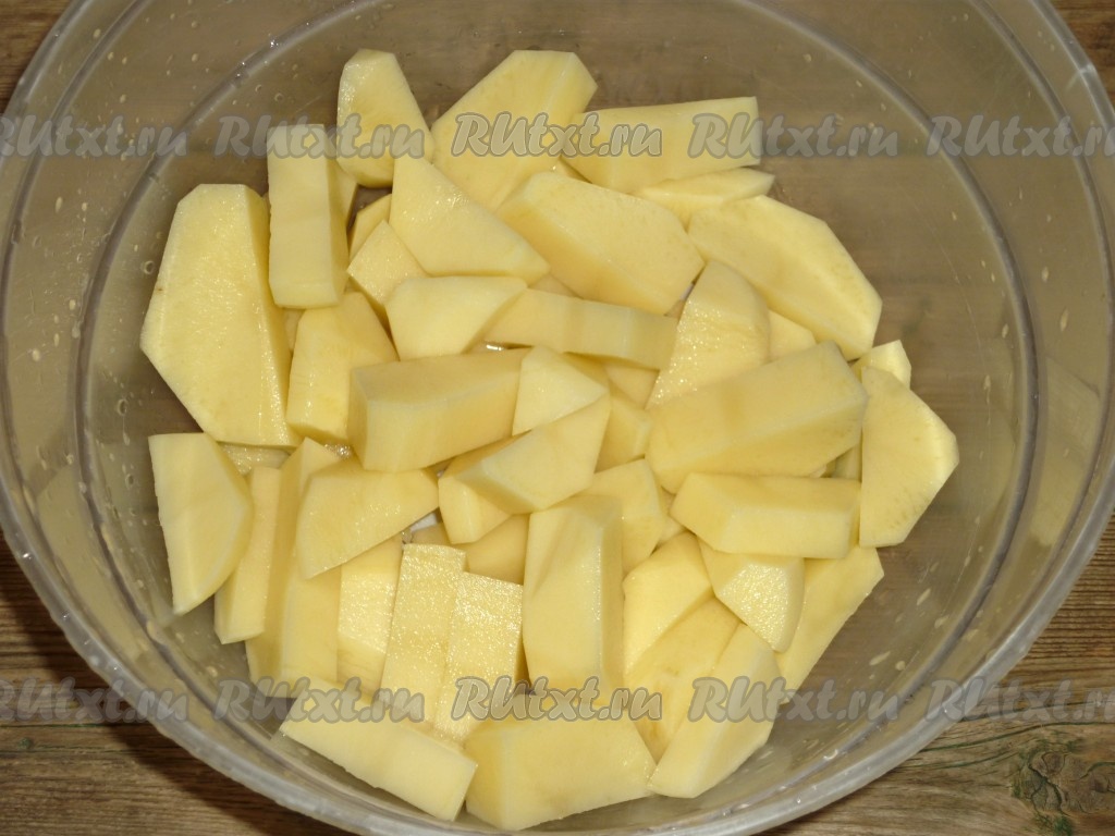 Картошку помыть, почистить, нарезать на ломтики и посолить.