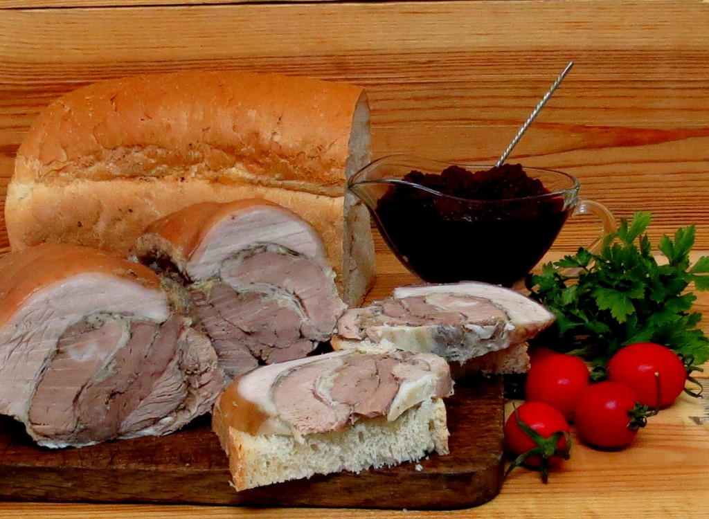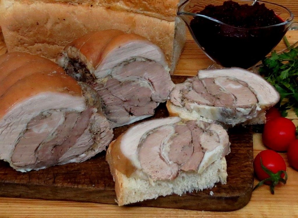 Через полтора часа рулет из подчеревка вынимаем из кастрюли с водой, снимаем с него плёнку выкладываем на противень. Жидкостью из пакета для запекания, выделившейся во время варки, поливаем рулет. Жидкости будет немного, но она поможет сохранить сочность мяса. Отправляем противень с рулетом в заранее разогретую духовку минут на 20, чтобы корочка немного зарумянилась. Температуру выставляем 230 градусов. Запеченное мясо достаём из духовки, даём остыть, снимаем нитки. Желательно остывшее мясо отправить на ночь в холодильник, тогда оно будет нарезаться тонкими пластами.