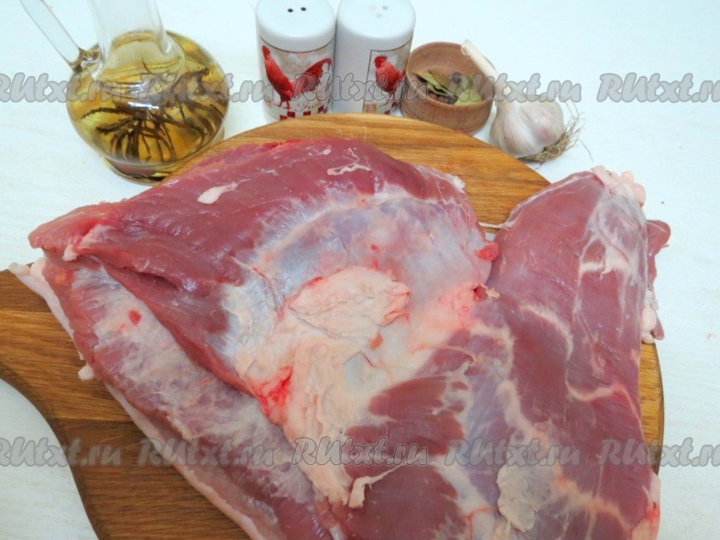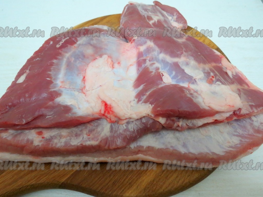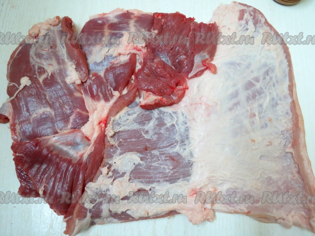 Так выглядит подчеревок. В нём чередуются слои мяса с тонкими прослойками сала. Но скрутить его в рулет сложно.