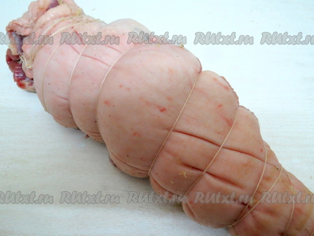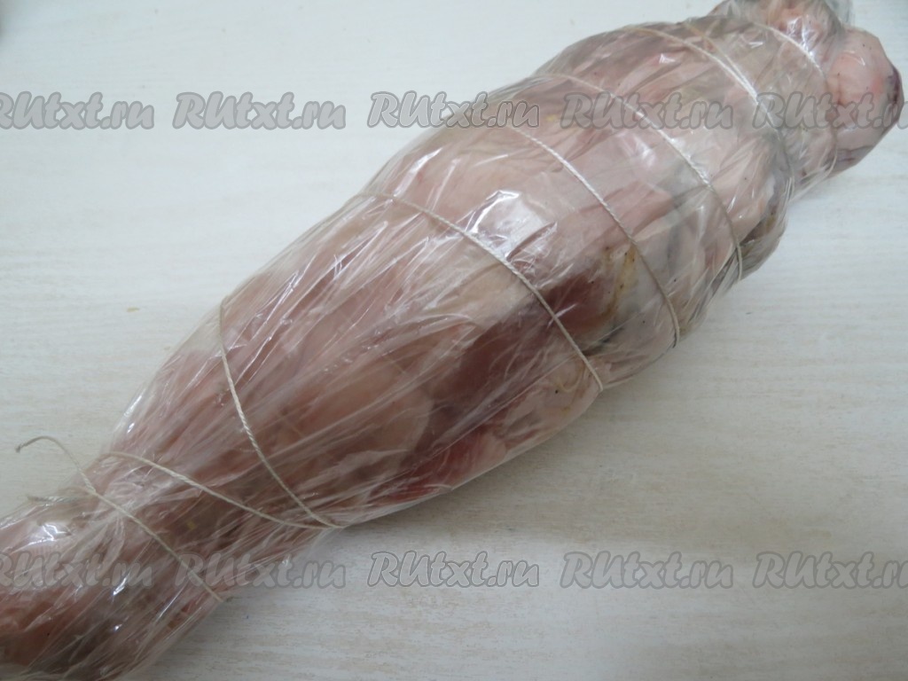 Скручиваем подчеревок рулетом и плотно связываем ниткой.