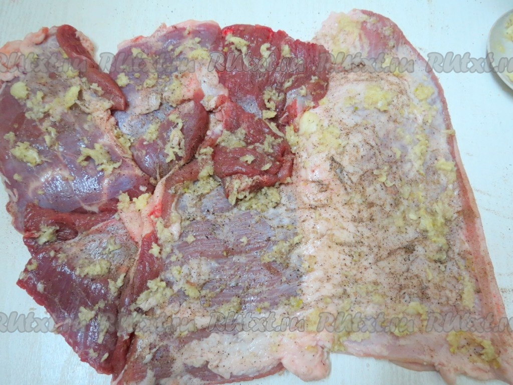 Мясо обильно смазываем выдавленным через пресс чесноком, солим и перчим.