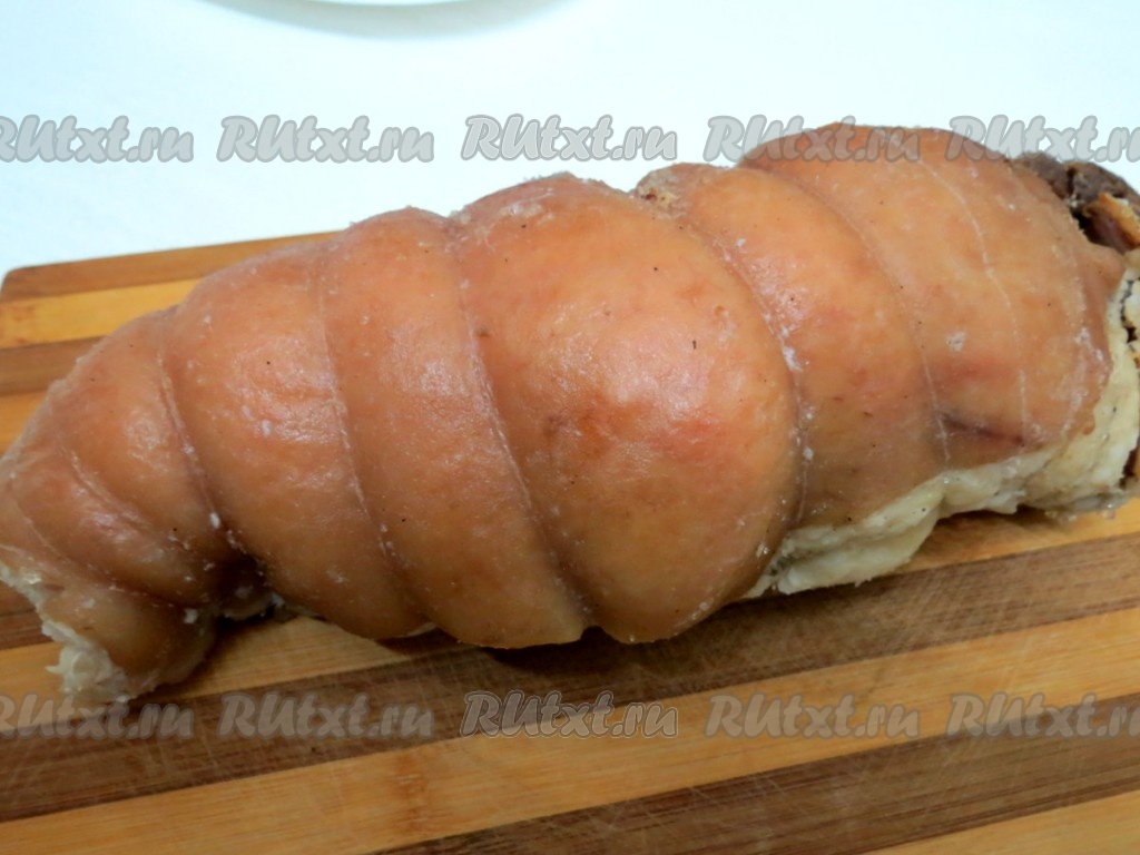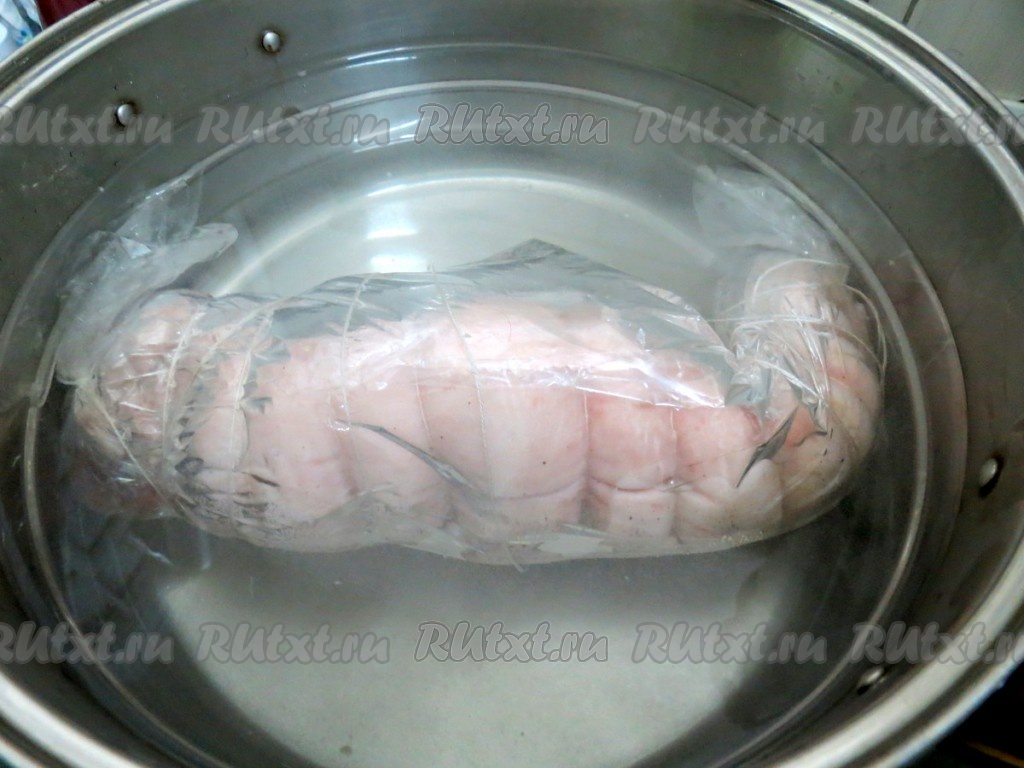 Плотно завязываем рукав с двух сторон, опять плотно обвязываем ниткой. Отправляем в большую кастрюлю, заливаем водой, чтобы мясо свободно плавало. Доводим воду до кипения, затем газ убавляем, чтобы кипело потихоньку. Варим под закрытой крышкой 1,5 часа.