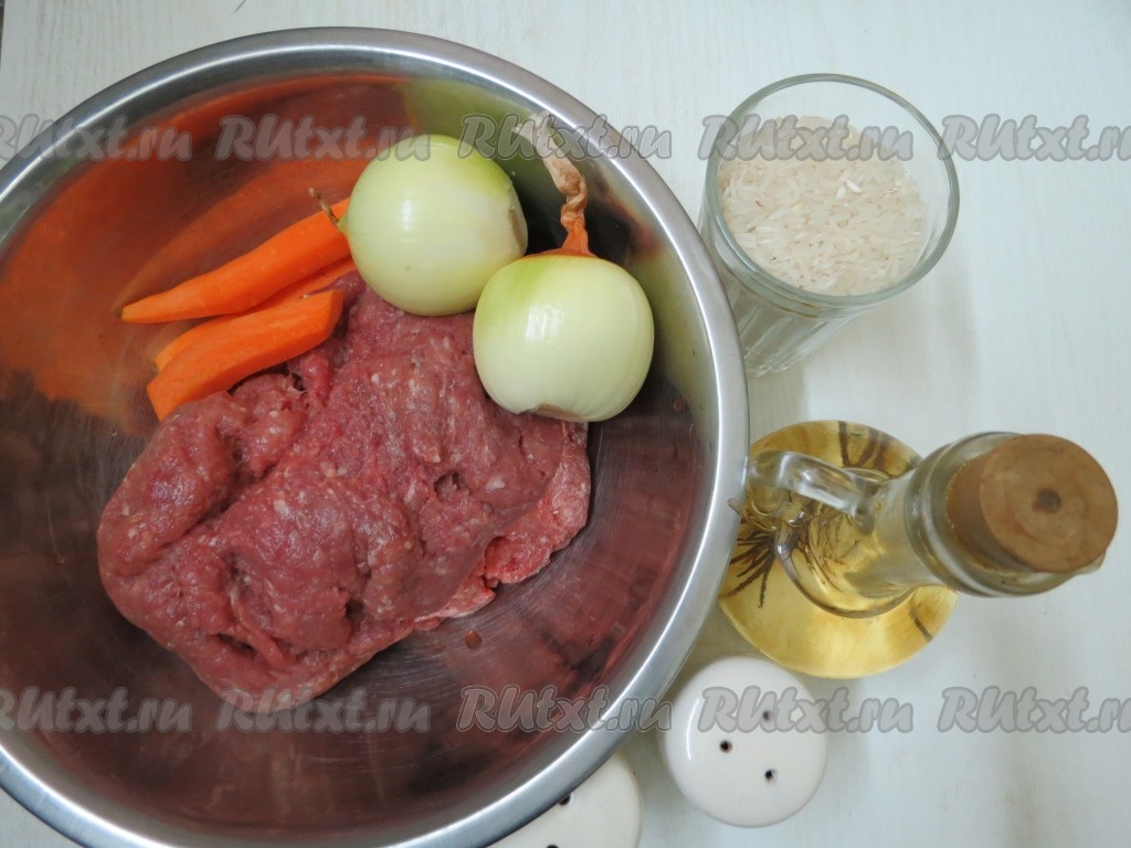 Для приготовления начинки для голубцов из савойской капусты нам понадобятся фарш, лук, морковь, рис, растительное масло, соль специи и чёрный молотый перец. Лук и морковь очищаем.