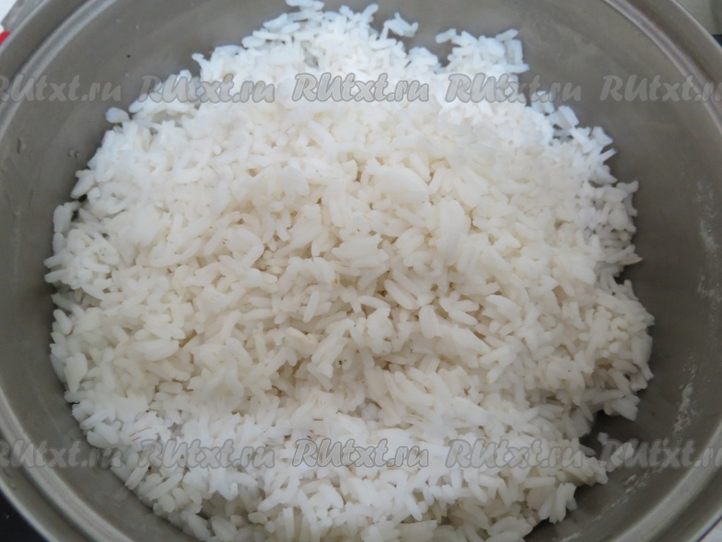 Рис промываем под проточной водой, затем засыпаем в кастрюлю с 2 литрами кипящей воды, даём закипеть, уменьшаем огонь, варим 10 минут (до полуготовности риса), затем откидываем на дуршлаг, даём немного остыть.