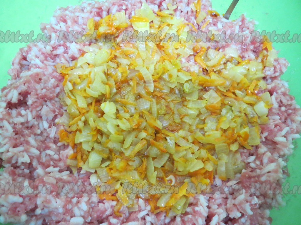 К фаршу добавляем рис, обжаренные лук и морковь, соль, перец, специи, тщательно перемешиваем.