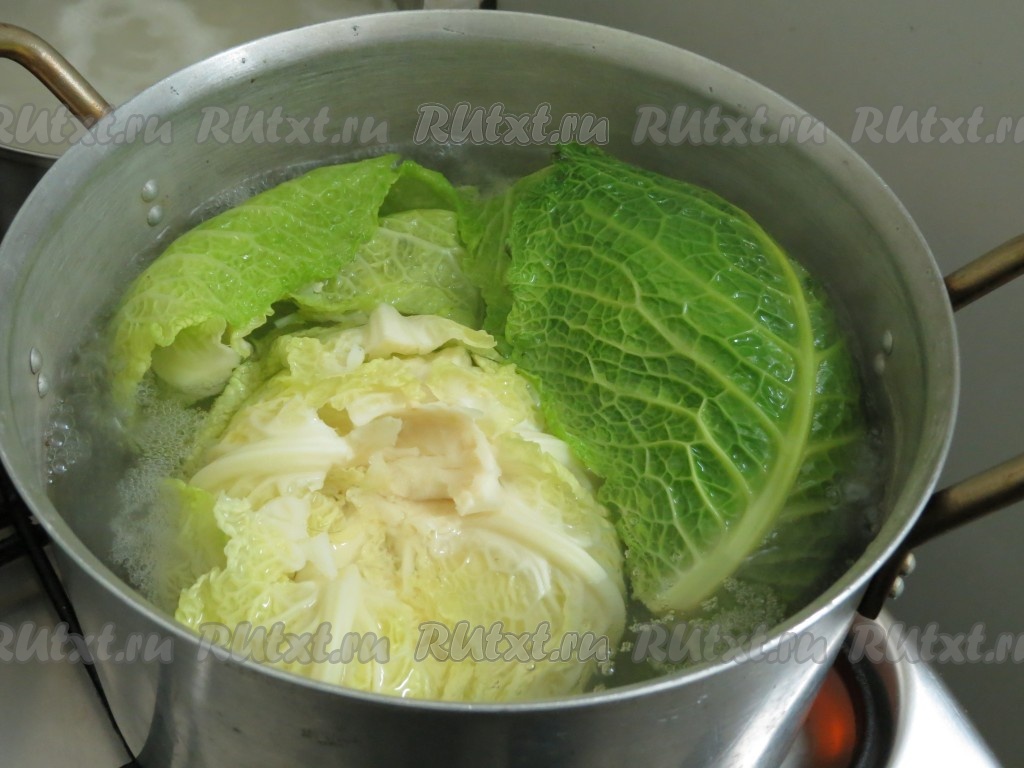 Помещаем капусту в кастрюлю с кипящей подсоленной водой, даём капусте покипеть 3-4 минуты. Затем листья выкладываем на дуршлаг и сразу отправляем под холодную воду, выключаем воду, даём листочкам немного обсохнуть.