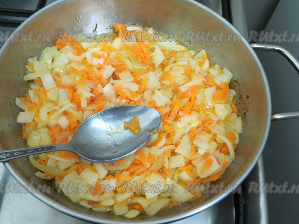 Лук и морковь мелко нарезаем и обжариваем на среднем огне на растительном масле, периодически помешивая, до золотистого цвета, убираем с огня, даём овощам немного остыть.