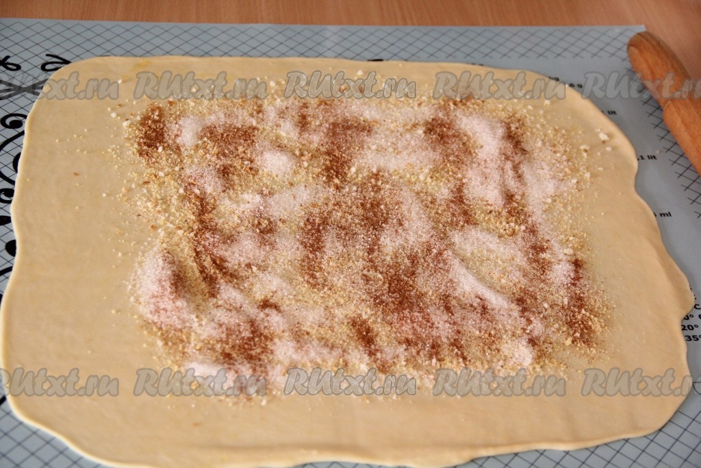 Посыпать пласт теста панировочными сухарями, затем - 1/2 сахара и 1/2 корицы, нужных для приготовления начинки. Края теста оставить пустыми.