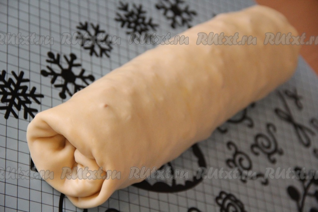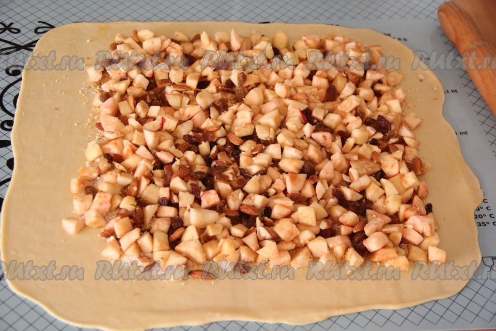 Посыпать поверх яблочной начинки оставшимся сахаром и корицей. Завернуть края теста на начинку и свернуть в тугой рулет.