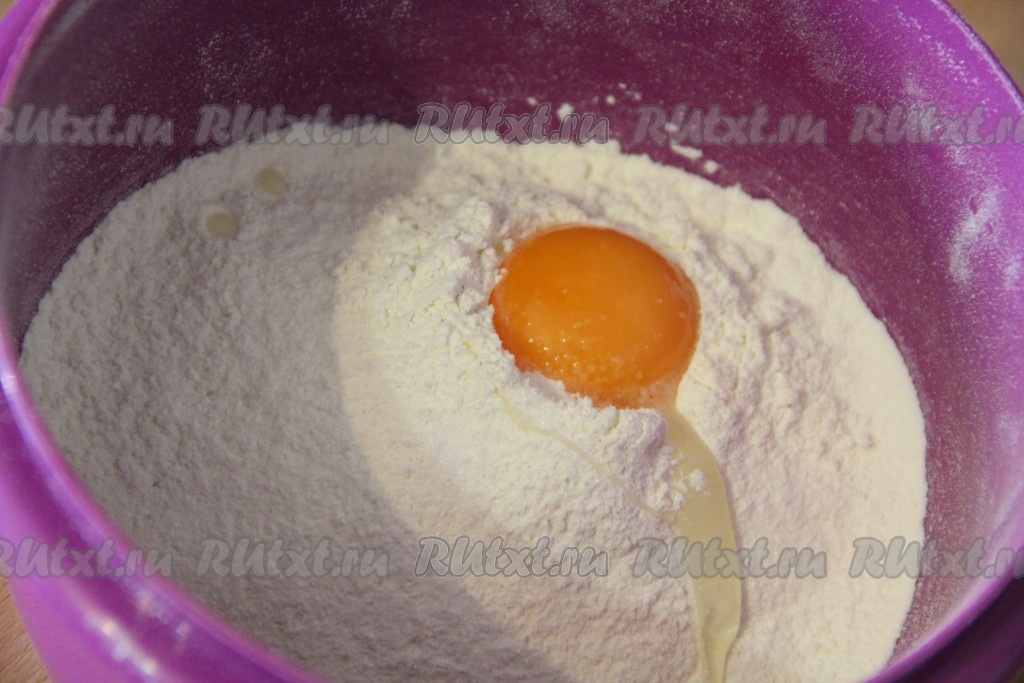 Муку просеять в глубокую миску. Добавить соль и яйцо. Всё слегка перемешать.